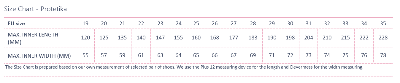 EU size: 19, Inner shoe length: 120, Inner shoe width: 55