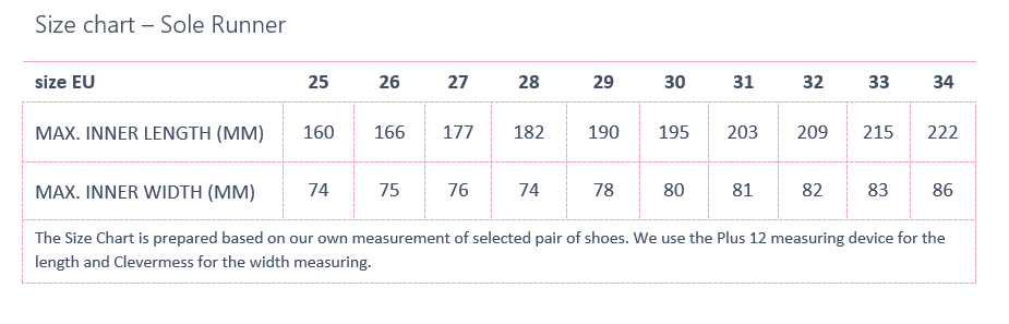 EU size: 32, Inner shoe length: 209, Inner shoe width: 82
