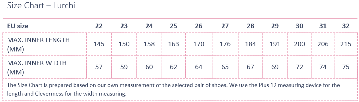 EU size: 22, Inner shoe length: 145, Inner shoe width: 57